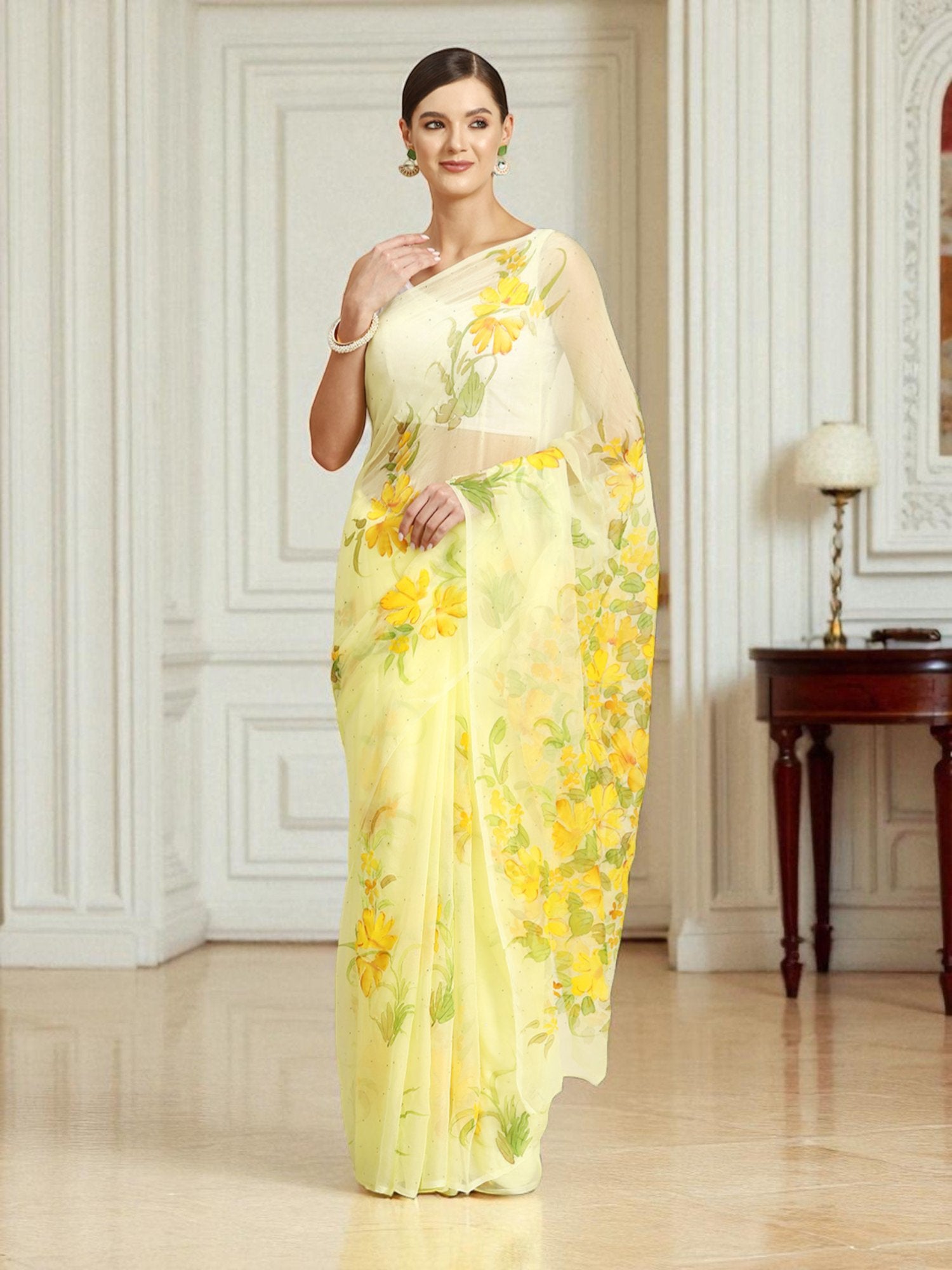 A hand-painted chiffon creation inspired by royal gardens — subtle, soft, and regal in every drape. Crafted by a single artisan, it is a symbol of meditative mastery.