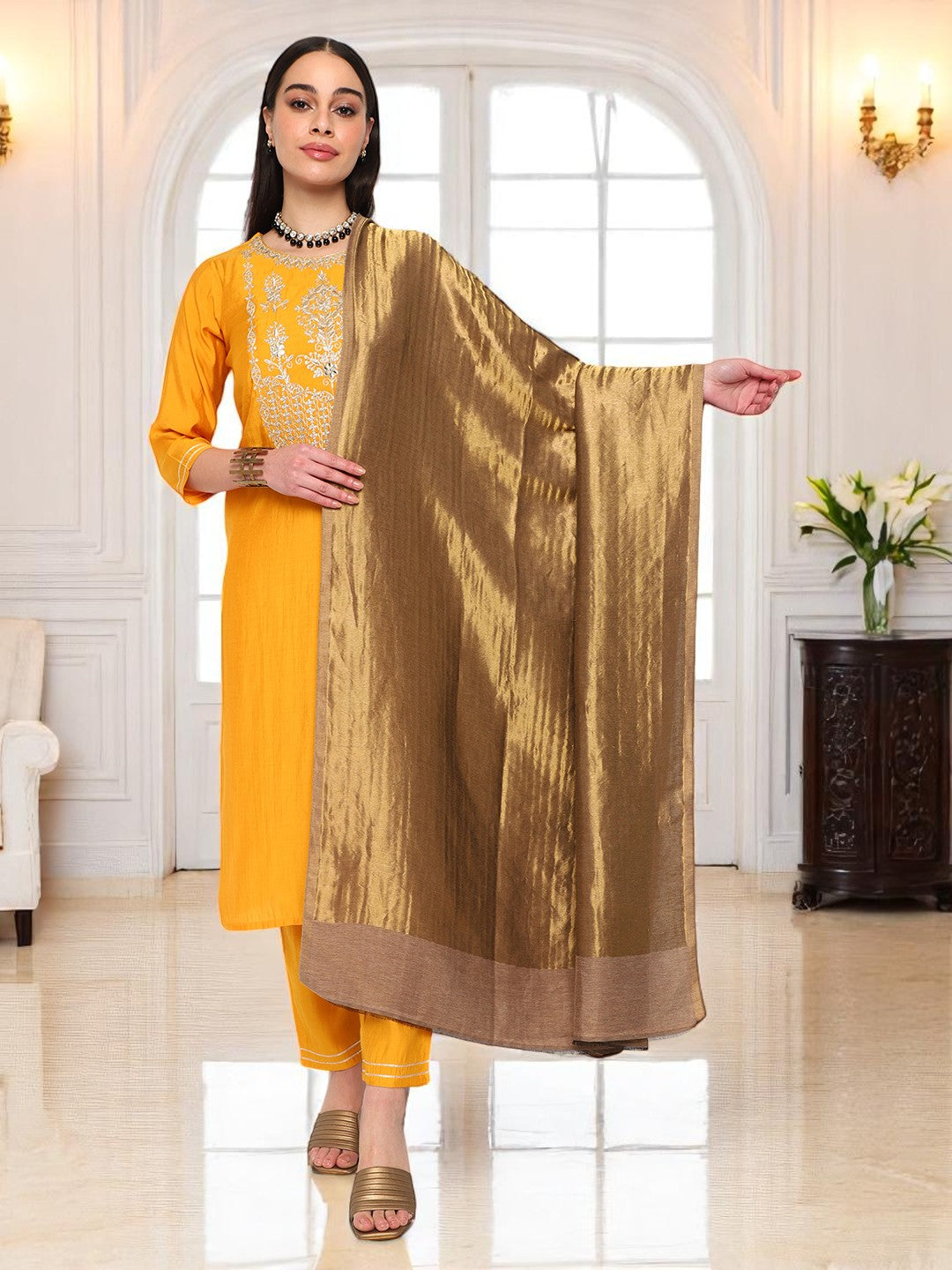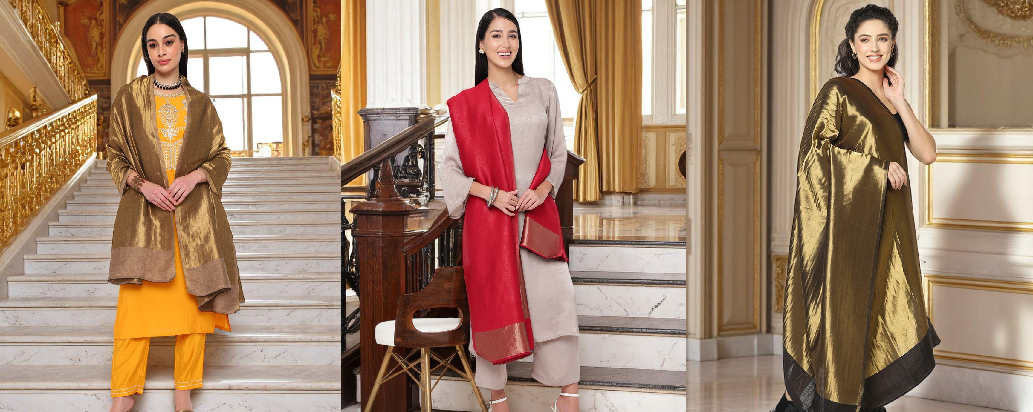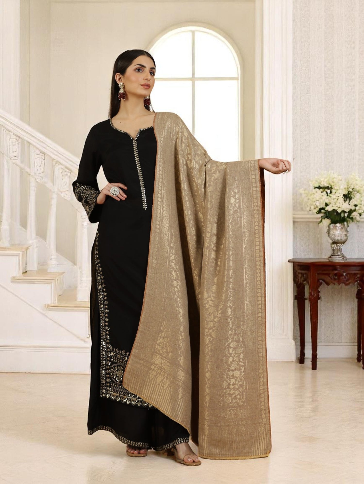The Regal Gold Shawl, Draped in quiet opulence, these woollen shawls features a golden front and a fine finish reverse. A timeless layer for those who command presence without effort.