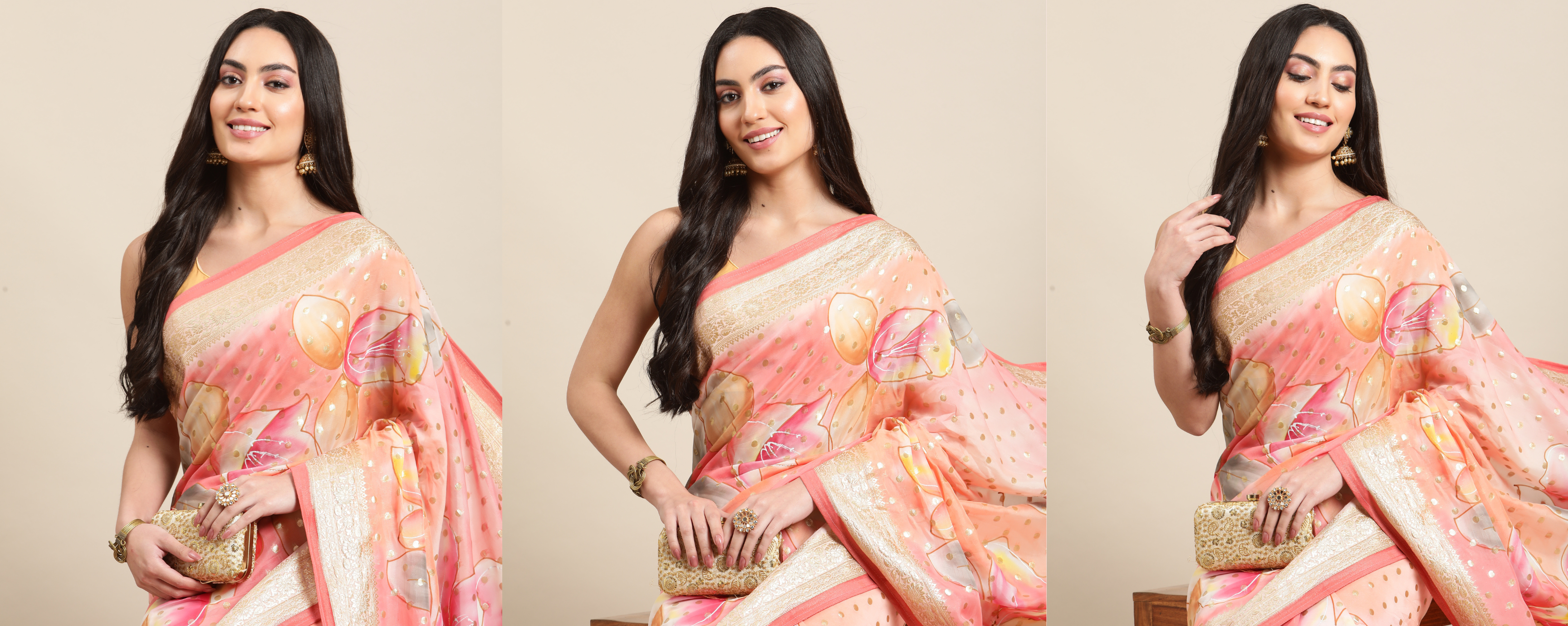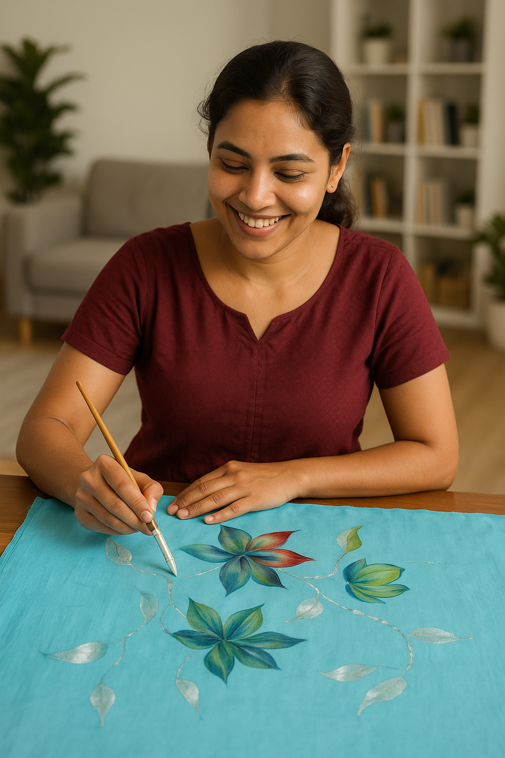 Our sarees, shawls, and scarves are created using age-old techniques — hand-painting, ombré dyeing, and zari weaving — keeping the soul of artistry alive in every stroke.