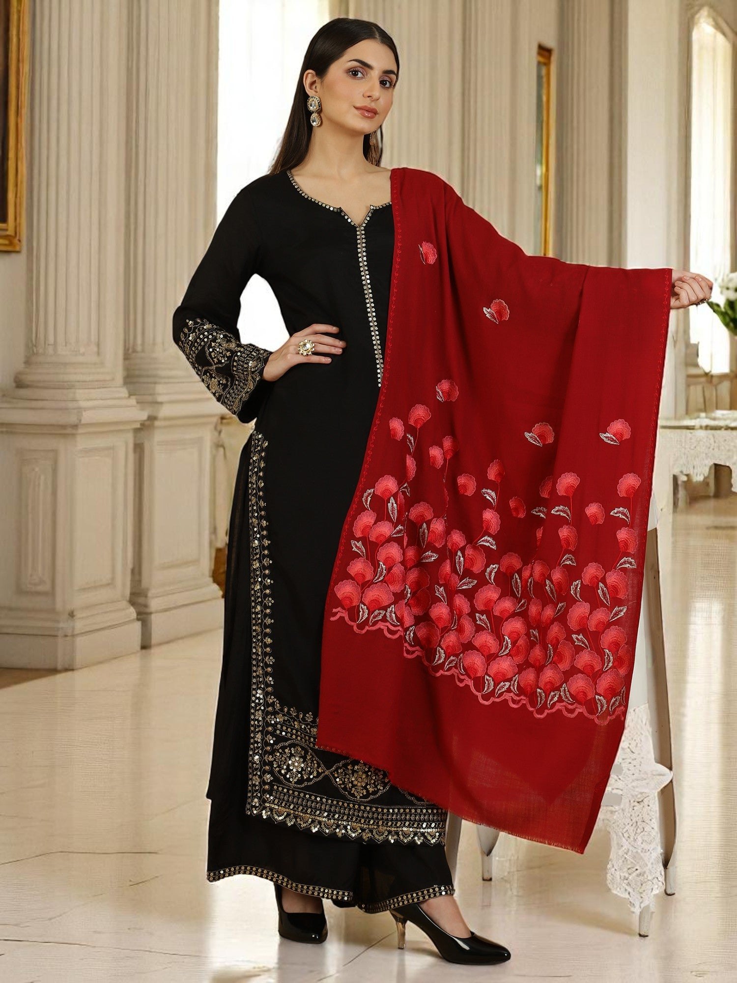Wrap yourself in the gentle warmth of soft wool, detailed with elegant floral embroidery that elevates every look. Lightweight yet cozy, this stole is perfect for breezy days and graceful evenings — a timeless layer of style and softness.